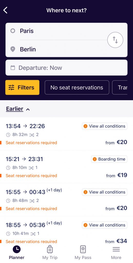 Si je vous ai convaincu·e et que vous vous êtes décidé·e à prendre un pass, vous devrez installer l’application Rail Planner, qui vous permet d’avoir votre pass dématérialisé et de planifier votre voyage. Vous aurez ainsi la possibilité de rechercher tous les trains éligibles, en activant ou non le filtre pour voir les trajets qui nécessitent de réservation.