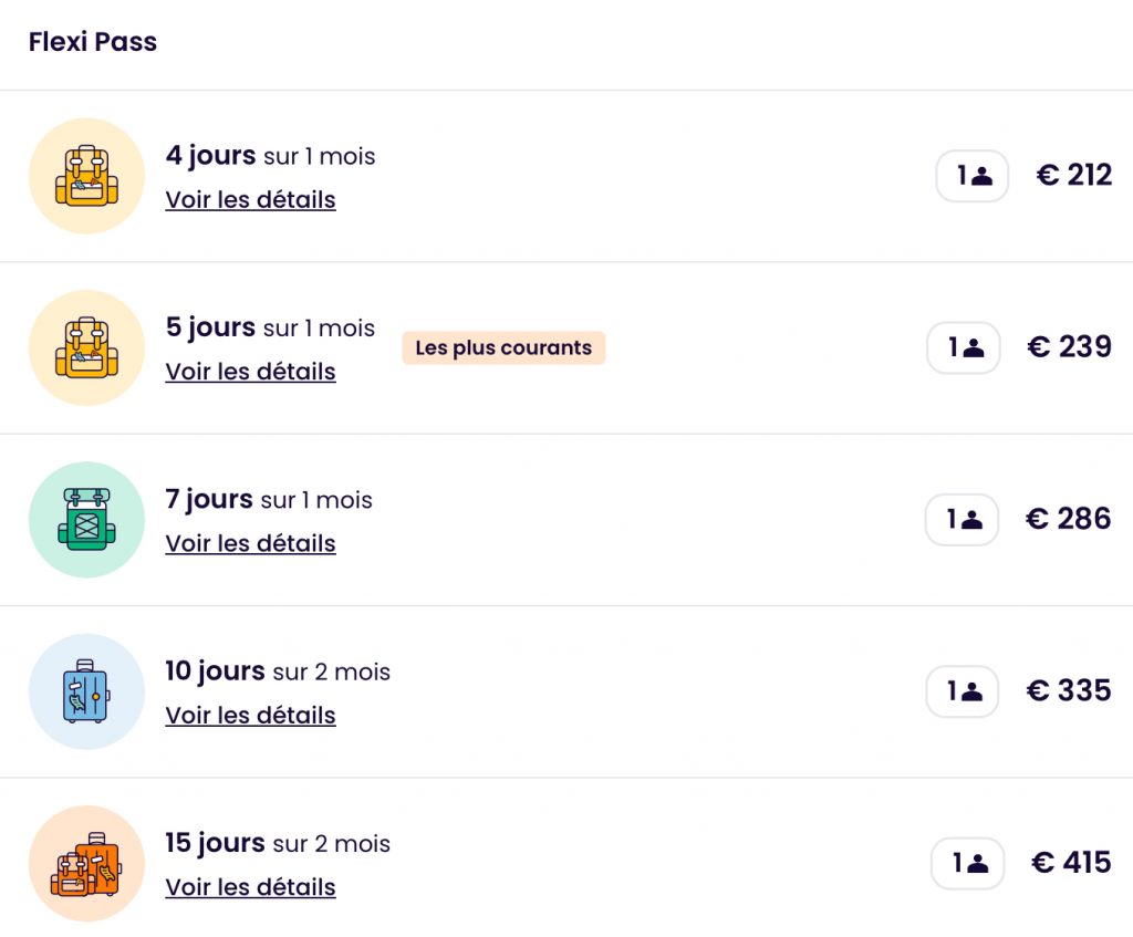 - Il existe aussi des pass spécifique à un pays (qui doit être autre que le pays dans lequel vous résidez).
