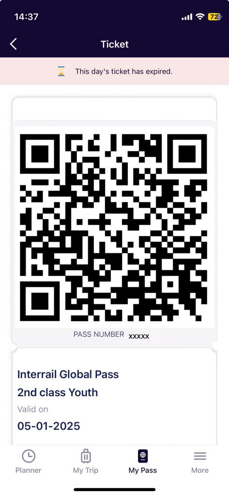 Lors de contrôle à bord du train, vous aurez simplement à montrer le QR code disponible dans l’onglet « My Pass » lorsque vous cliquez sur le bouton jaune « Show ticket » Les voyages prévus du jour sont également affichés sous le QR code ainsi que des informations complémentaires telles que votre numéro de pass, vos coordonnées et la date d’activation.